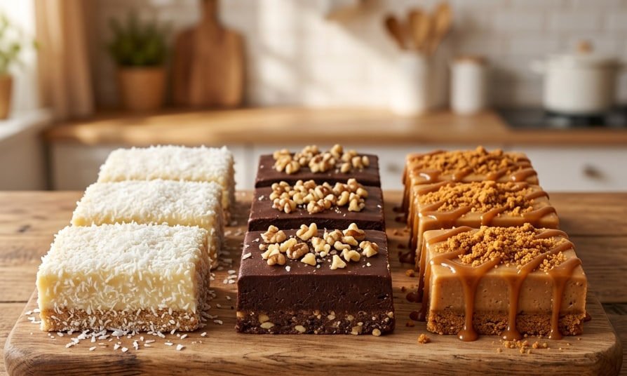 Kao što možete videti na fotografiji, od jedne osnovne baze sa mlevenim keksom kreirali smo tri potpuno različita vizuelna i ukusna doživljaja: nežne bele kocke sa kokosom, bogate tamne kocke sa čokoladom i orasima, i neverovatno sočne kocke sa prelivom od karamele. Svaki presek je savršeno precizan i stabilan. Prateći naše detaljne korake, uspećete da napravite ovu slatku magiju za tili čas.
