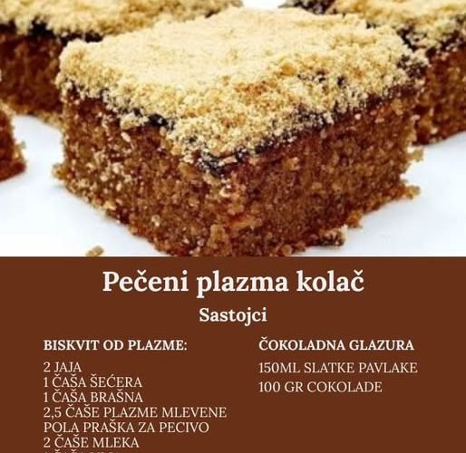 Pečeni plazma . Ludilo od – obavezno probajte – mera na čaše. BISKVIT OD PLAZME: 2 JAJA 1 CASA SECERA 1 CASA BRASNA 2,5 CASE PLAZME MLEVENE POLA PRASKA ZA PECIVO 2 CASE MLEKA 1 CASA ULJA 1 SUPENA KASIKA KAKAA PECI NA 180C-40MIN DIMENZIJA TEPSIJE 20X30CM CASA JE OD 180ML -OD JOGURTA PREKO PECENOG … Read more