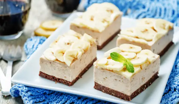 Mus se sipa na stegnutu čokoladnu koru i zaglađuje se. Desert se hladi minimum 4 sata dok ne postane potpuno stabilan. Banane za ukras se seku na tanke kolutiće, zalivaju se limunovim sokom i gusto se ređaju odozgo.