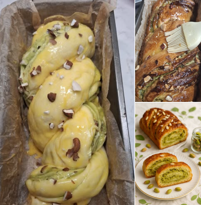 Najpre zamesicu testo.U mlako mleko stavljam kasiku secera i kvasac .promesam pa ostavim da fermentise 5 min.Puter otopim i pomesam sa pola kolicine brasna ,dodam vanilin šecer jaje i mleko sa kvascem pa sve zajedno promesam .Dodam ostatak brasna i zamesim meko testo.Pokrivam ga,i ostavim 1 sat na toplom da se udvostruči.Testo razvijem na pobrasnjenoj povrsini dim 40 x30 cm pa preko njega stavljam 100 gr omeksalog putera i pistac kremu fino premažem.Pospem seckanm bademima i pažljivo uvijem rolat.