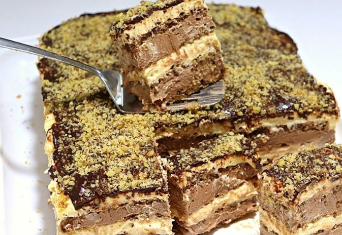 Od ovih sastojaka ispeći 2 kore pa ih zatim podeliti na pola tako da dobijete 4 korice. Pečite korice u plehu dimenzije 35/45cm. i pečite u zagrejanoj rerni na 180c./10min.