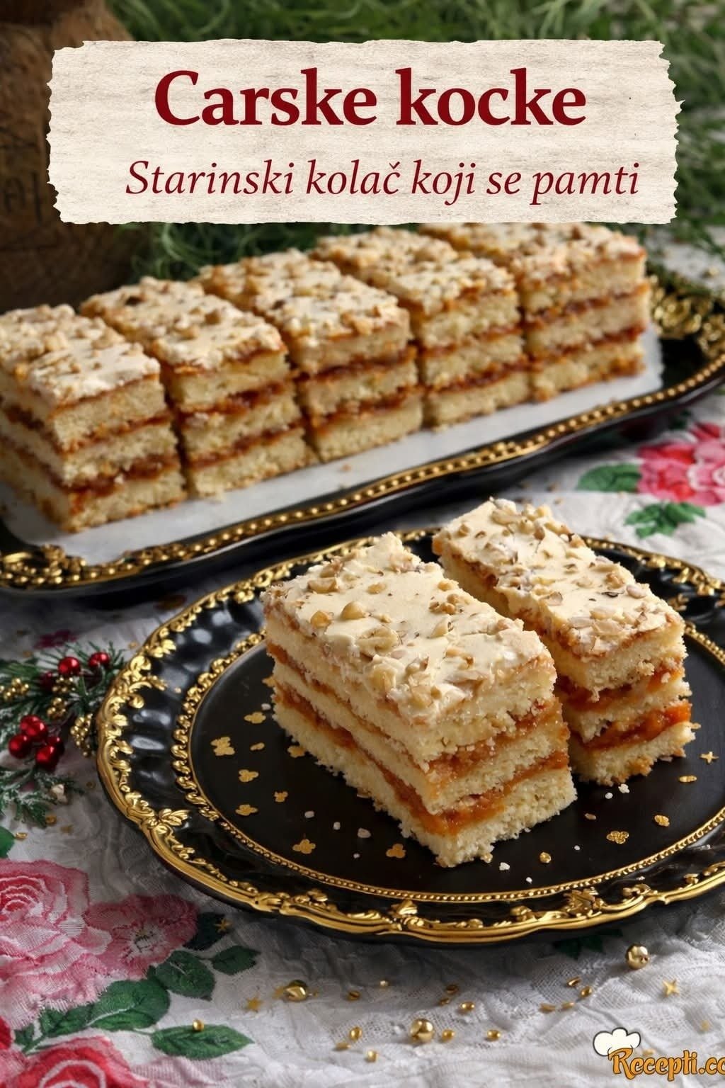 Carske kocke su jedan od onih kolača koji nose priču, miris detinjstva i sećanje na stare sveske sa receptima koje su se čuvale u fiokama kuhinjskih ormarića. To je kolač koji se nije pravio svaki dan, već kada se želi nešto posebno, nešto bogato i svečano, ali i domaće i provereno. Uvek su bile znak da dolaze gosti, da se slavi ili da je nedelja i da se porodica okuplja oko stola. Njihov ukus je pun, slojevit i topao, baš onakav kakav samo starinski kolači mogu da imaju.