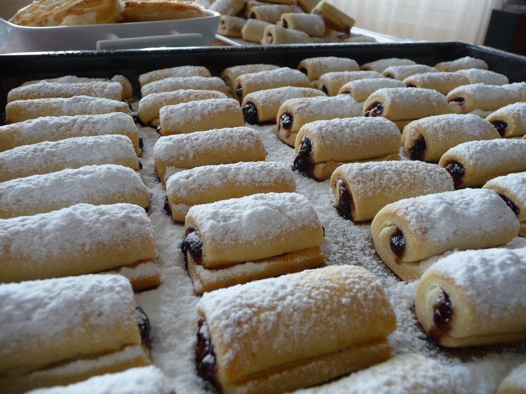 Kad se izvadi iz hladnjaka, ovu količinu podijeliti na dva dijela. Uzeti prvi dio i tanko razvaljati , ali pripaziti da bude više pravokutnik a ne krug. Zatim paralelno na suprotne duže strane mazati pekmez, preklopiti jednom i tanko namazati razmućenim žutanjkom pa preklopiti još nednom i odrezati te malo pomaknuti ili prebaciti sve na jednu stranu. Postupak nastaviti sve dok se ne potroši tijesto. Isto ponoviti i sa drugom polovicom tijesta.