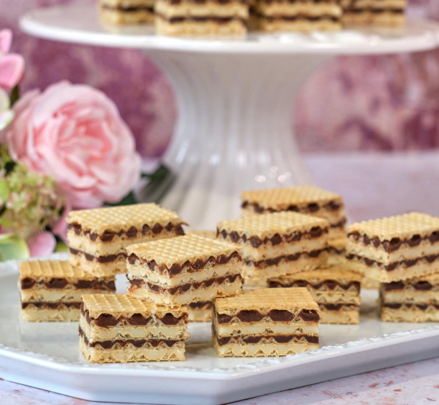 Nanijeti tamnu kremu na oblatnu, rasporediti do rubova i prekriti oblatnom sa širim utorima prema gore.