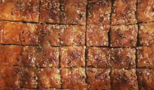 Ostavlja se nekoliko sati da se ohladi i jednostavna baklava sa orasim i maslacema se preliva preostalim sirupom.