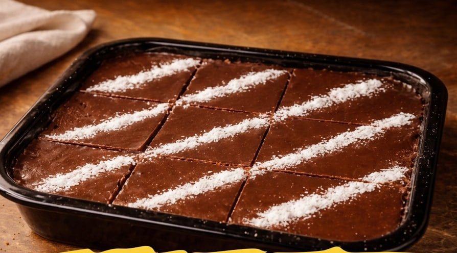 4. Čokoladna glazura i dekoracija Na pari ili na veoma tihoj vatri otopite 100 g čokolade zajedno sa 3 kašike ulja. Ulje će glazuri dati predivan sjaj i sprečiti pucanje prilikom sečenja. Prelijte toplu glazuru ravnomerno preko ispečenog kolača. Kada se glazura malo stegne, isecite kolač na kocke, a zatim preko svake kocke dijagonalno pospite malo kokosa (iskoristite one 3 kašike sa spiska) kako biste dobili izgled tačno kao na fotografiji.