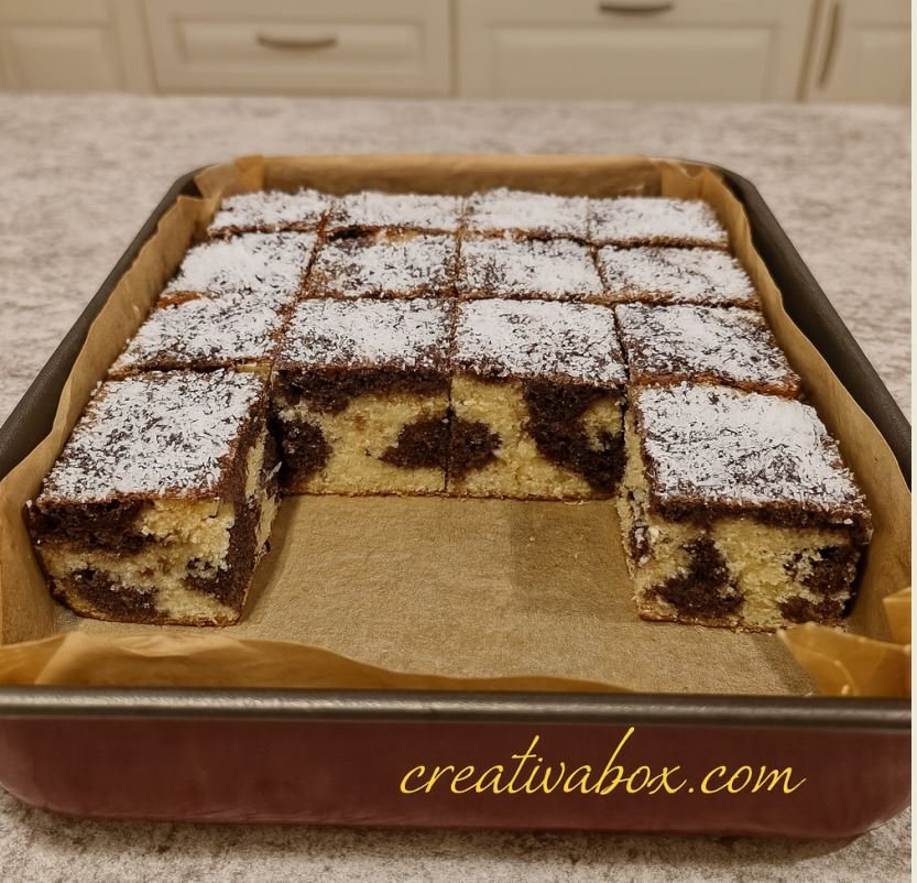 Podeli smesu: Sipaj ½ smese u pripremljen pleh; u preostalu polovinu umešaj 3 kašike kakaa i izlij preko prve (mramorni efekat).