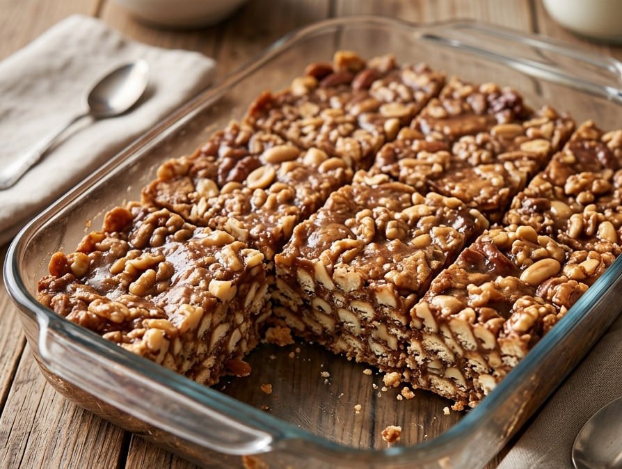 Kao što se vidi na fotografiji, ovaj kolač obiluje krupnim komadima keksa, oraha i kikirikija, a sve to je povezano u kompaktnu celinu sočnim, karamelizovanim sirupom. Najbolja stvar kod ovog recepta je što priprema traje svega 15 minuta i ne zahteva uključivanje rerne, pa je idealan i za iznenadne goste i za praznične trpeze.