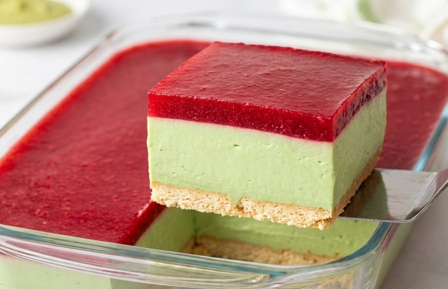 Korak 5: Završni sloj i hlađenje Izvadite kolač iz frižidera i preko ohlađenog krema od pistaća lagano prelijte topao (ali ne vreo) preliv od malina. Špatulom pažljivo poravnajte crveni sloj od ivice do ivice. Kolač vratite u frižider na najmanje 4 do 6 sati (idealno preko noći).