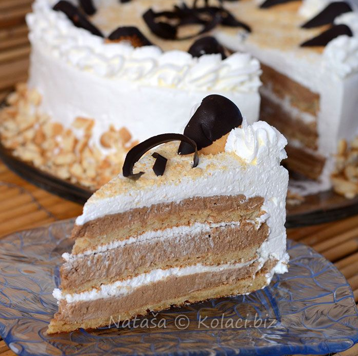 1. Za kore izradite 4 bjelanjka u čvrsti snijeg, te dodajte postepeno 4 žlice šećera, ubacite i 4 žlice mljevenog keksa koji lagano sjedinite sa pjenjačom. Keks za kore uzimate od onih 300 gr.