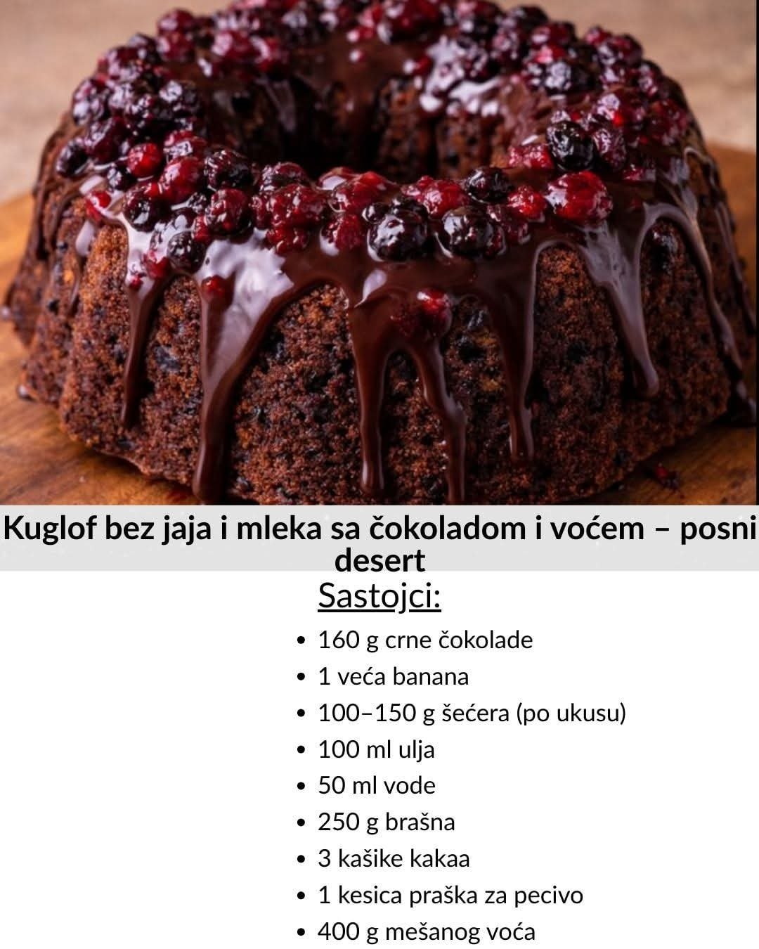 Kuglof bez  jaja i  mleka je jedan od onih recepata koji dokazuju da posni  kolači mogu biti jednako bogati, mekani i puni ukusa kao i klasični. Ovo je desert koji se pravi jednostavno, bez komplikovanih koraka, a rezultat je kolač koji izgleda lepo, miriše na dom i ostaje sočan danima. Čokolada i voće u njemu stvaraju savršenu ravnotežu između slatkog i osvežavajućeg, pa se kuglof jede lagano, bez osećaja težine.