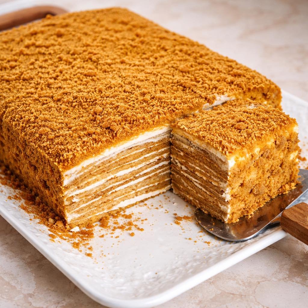 Medena torta, topi se u ustima. Kore s okusom meda su veoma ukusne. Veoma jednostavno napraviti.