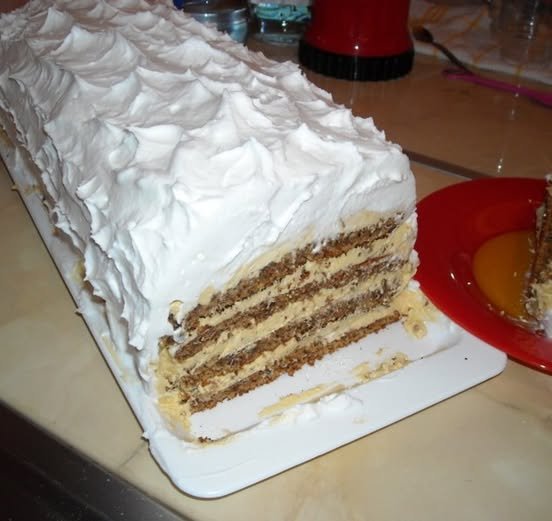 Posebno skuvati 1/2 l mleka sa 5 kasika gustina i 5 kasika secera(kuva se kao puding). Umutiti 2 margarina ili maslaca(sta vise volite).