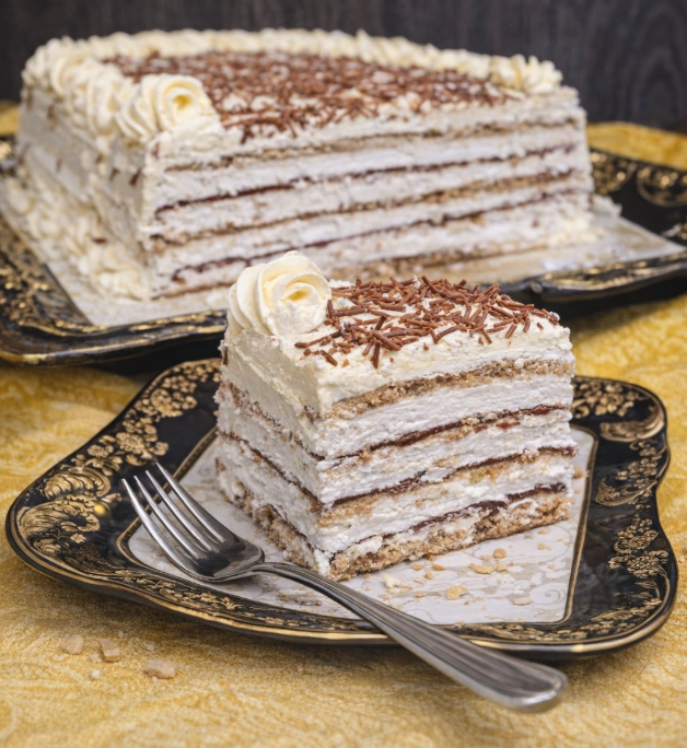 Za završni izgled pospite čokoladne mrvice ili rendanu čokoladu preko torte, a po želji možete napraviti i ružice od šlaga kao na slici. Tortu obavezno ostavite u frižideru minimum 3–4 sata, a idealno preko noći, kako bi se svi slojevi lepo povezali i omekšali. Ova torta je savršeno izbalansirana — kore su lagane i blago orašaste, dok je fil kremast i bogat, ali ne težak. Idealna je za svaku priliku, od porodičnih okupljanja do slavlja, jer izgleda elegantno, a ukus joj je klasičan i svima omiljen.