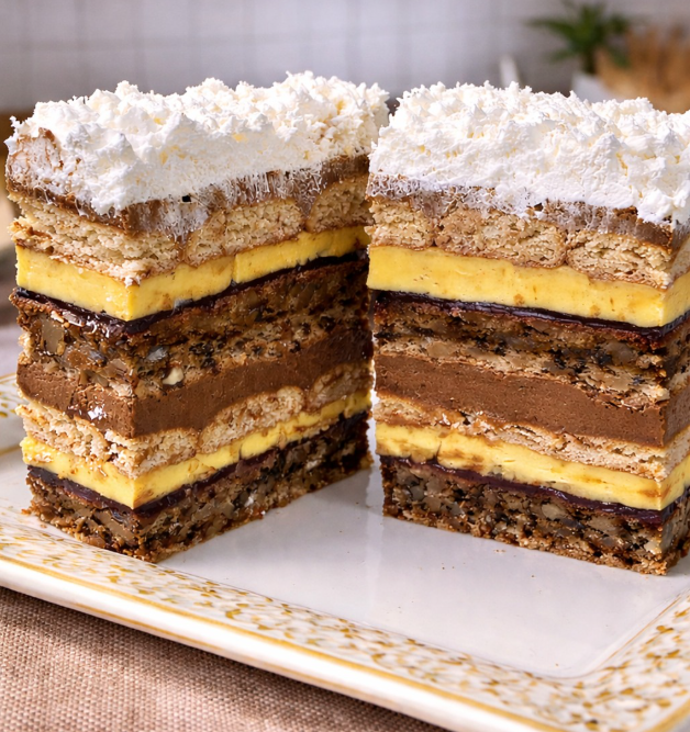 Ova torta je prava slojevita čarolija – bogata, kremasta puna ukusa, potpuno posna, bez mleka jaja. Svaki sloj daje poseban doživljaj, zajedno čine desert koji izgleda kao iz najlepše poslastičarnice.