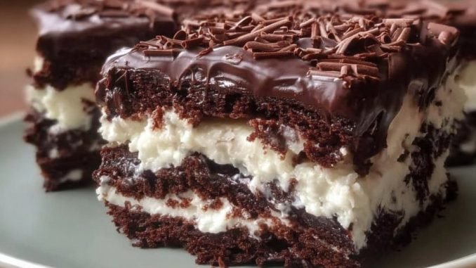 Sklapanje torte: Kada se torta ohladi, viljuškom ravnomerno izbušite površinu. Nanesite polovinu smese od kokosa preko torte, vodeći računa da deo uđe u izbušene rupice. Zatim premažite polovinom čokoladne smese. Ponovite ovaj postupak sa preostalim slojevima kokosa i čokolade.