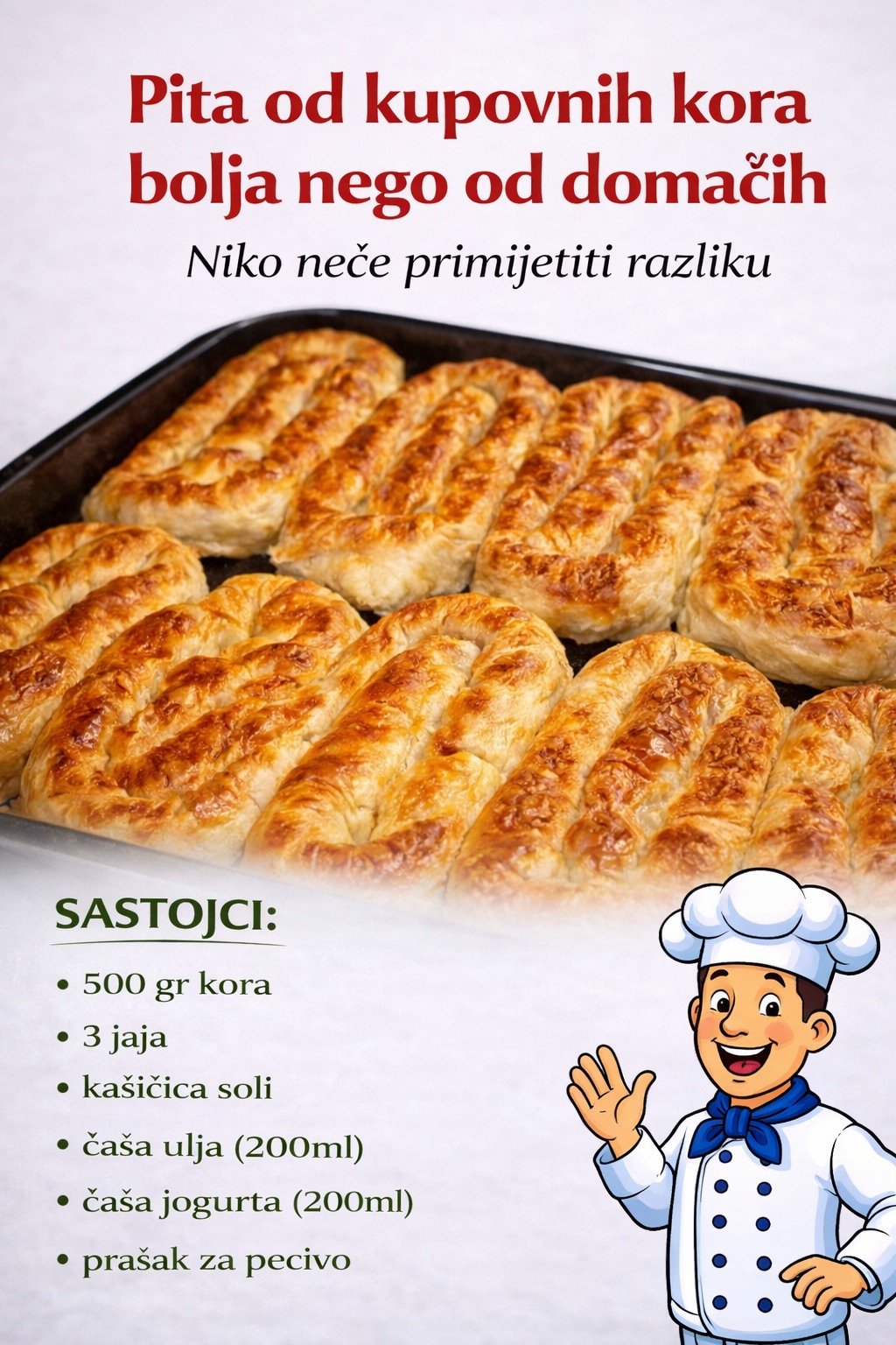 Za ovu pitu mnogi nisu vjerovali da je od kupovnih kora.Ako pratite sve korake i vi mozete za tren da napravite istu.Ova pita je idealna kada nemate volje da razvijate ili kada želite nesto na brzinu da napravite.