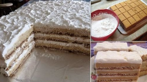 Zatim redajte tortu u tepsiju (35 x 25 cm.): Keks, Fil, Slag – Keks, Fil, Slag itd. Tako napraviti 4 reda i obloziti tortu sa slagom.