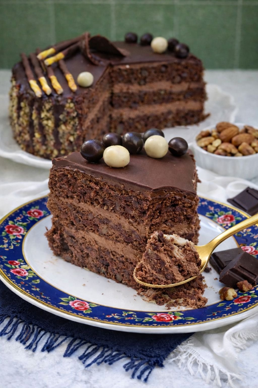 Najpre ce mo ispeci biskvit. Žumanca posebno izmiksajte sa secerom. Dodajte istopljenu prohladjenu cokoladu i samleve ne orahe pa sjedinite špatulom. Dodajte brasno pa opet sjedinite,i na kraju ulupan sneg od belanaca,postepeno i polako sve sjedinite. Kalup dim 22 cm obložite papirom a ivice premažite margarinom i pospite brasnom pa rasporedite smesu.Pecite na 170 C oko 35 do 40 min pazeci da neizgori.