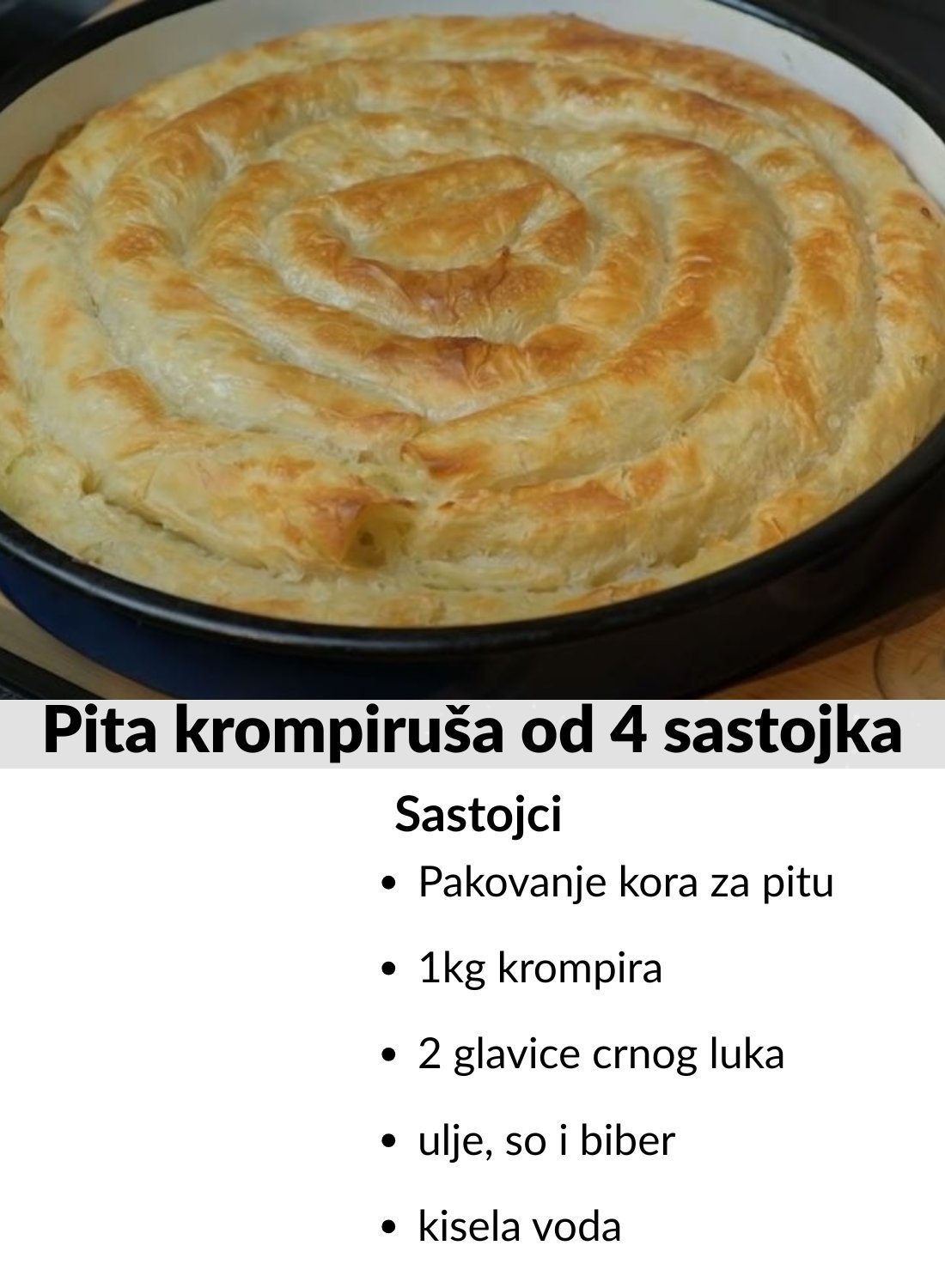Priprema: Izrendajte krompir, a luk propržite na malo ulja. Zatim izemšajte smesu, filujte kore koje ste premazali kiselom vodom i sve savijte u pleh. Pecite na 200 stepeni Celzijusa oko pola sata do 40 minuta.