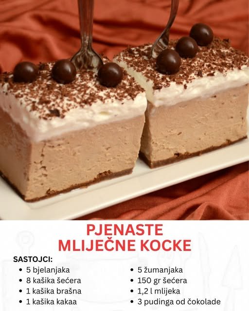Ovaj kolač, iako jednostavan na prvi pogled, spaja tri savršena sloja: nježnu koru od bjelanjaka, bogatu čokoladnu kremu i pjenasti šlag. Rezultat je savršena harmonija okusa – ne previše slatka, a opet dovoljno raskošna da se topi na jeziku.