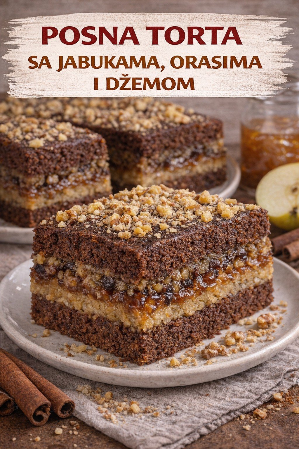 Sočna posna torta sa jabukama, orasima i džemom – miris cimeta i jabuka daje joj pravi domaći ukus.
