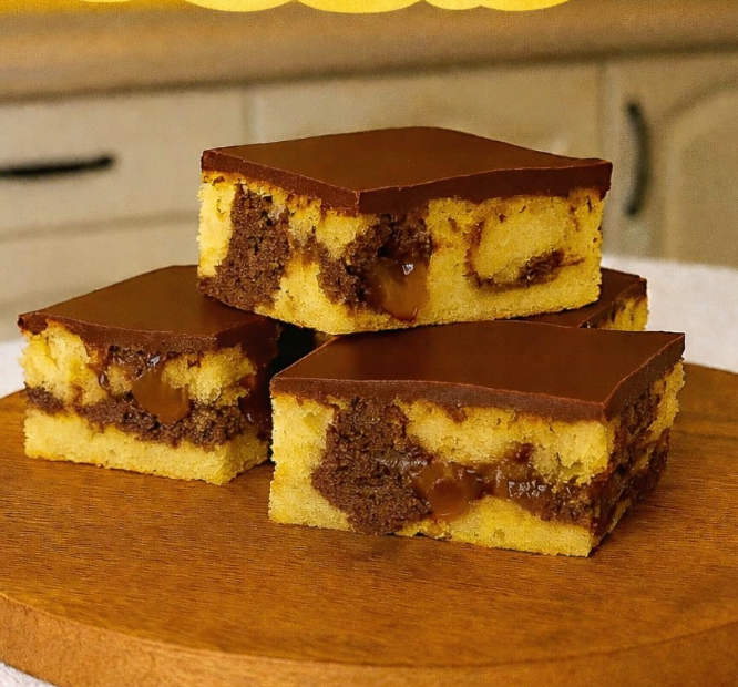 Odvojiti oko 1/3 smese i u taj deo dodati kakao. Svetli deo sipati u pleh obložen papirom za pečenje, zatim kašikom dodavati tamni deo. Na više mesta staviti džem, pa lagano prošarati čačkalicom ili nožem da se dobije lep šareni uzorak.