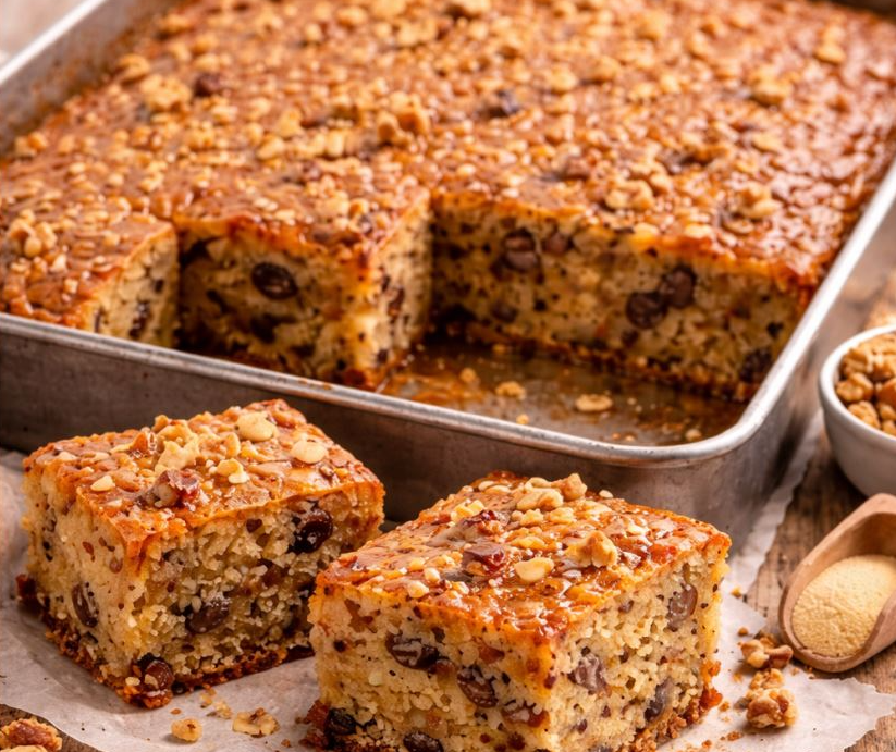 Ovo je jedan od onih starinskih posnih kolača koji uvek uspevaju. Pravi se bez jaja i mleka, sve se meri šoljicom i meša u jednoj posudi. Nakon pečenja, kolač se preliva toplim vanilin sirupom, pa postaje izuzetno sočan, mekan i mirisan. Griz mu daje punu strukturu, orasi blagu hrskavost, a suvo grožđe prirodnu slatkoću. Idealan je za post, slave i dane kada vam treba brz domaći kolač.Пекарски производи