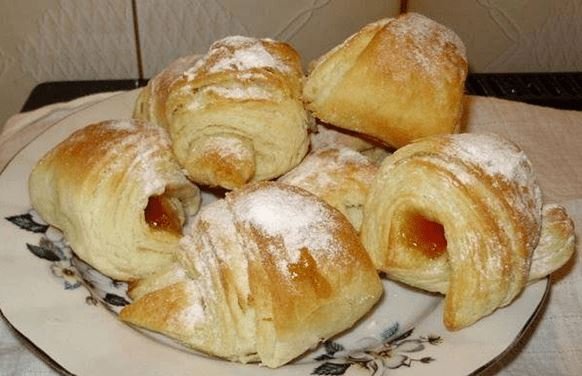 Ostaviti da miruje 1/2 sata. Sve ponoviti još dva puta. Nakon toga razvaljati, rezati na trokute, na svaki trokut staviti malo marmelade, zaviti i ostaviti kifle da narastu pa staviti peći na 200 stupnjeva. Pečene posuti šećerom u prahu.