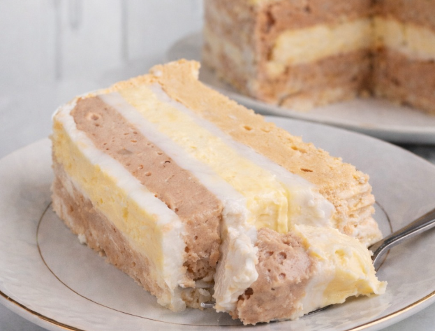Na tacnu za serviranje stavite prvu lentu kore, premažite je čokoladnim filom, poklopite drugom korom, zatim nanesite vanila fil i završite slaganje trećom lentom kore.
