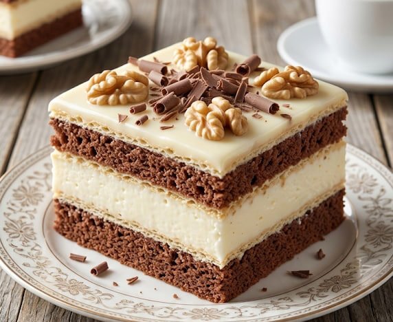 Kao što možete videti na fotografiji, ovaj desert izgleda izuzetno raskošno. Za razliku od običnih ledenih kocki, ova verzija se pravi sa dve kore, između kojih se krije vazdušasti vanila krem, dok je vrh ukrašen belom glazurom, orasima i čokoladnim strugotinama. Prateći ovaj detaljan recept, dobićete kolač koji izgleda i miriše tačno onako kako je prikazano na slici!