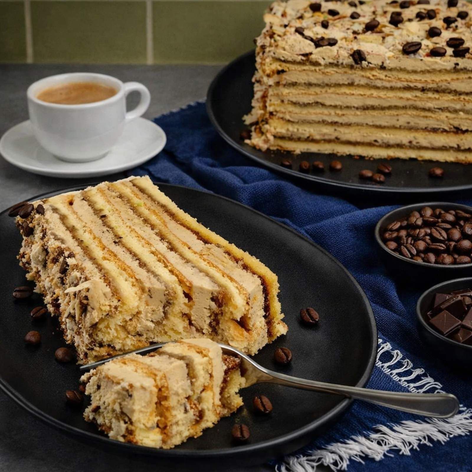 Peceni biskvit ohladite,pa prerezite na cetiri jednaka dela I premazite kafom u koju ste