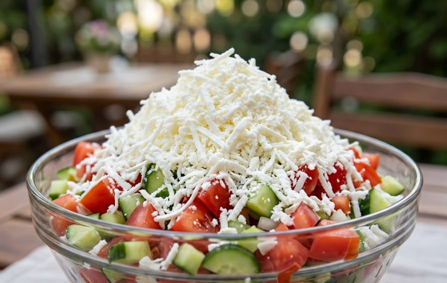 3. Rendanje sira (Najvažniji korak) Ključna stvar kod prave Šopske salate je da se sir nikada ne meša sa povrćem u činiji! Ako ga umešate, salata će postati mutna i gnjecava. Uzmite komad tvrdog belog sira i narendajte ga na krupno rende direktno preko onog začinjenog povrća. Napravite bogatu, “snežnu” planinu od sira na vrhu, baš kao što vidite na fotografiji.