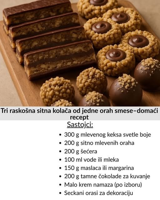 Ovaj recept je pravi dragulj domaće kuhinje, jer od jedne osnovne smese od oraha dobijate čak tri različita sitna kolača, svaki sa svojim karakterom, a svi jednako bogati i ukusni. To je ona vrsta recepta koji su naše bake posebno volele, jer je praktičan, izdašan i uvek ostavlja utisak raskoši na tacni. Kada se ova tri kolača poređaju jedan pored drugog, izgledaju kao da su pravljeni odvojeno, a zapravo sve počinje od iste, mirisne orah smese.